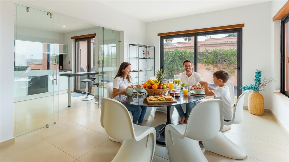 The villa is on the ground floor which makes it ´´cozy´´ and has three bedrooms for seven people, living room and kitchenette, a covered terrace facing south and pool views with ample deck space...